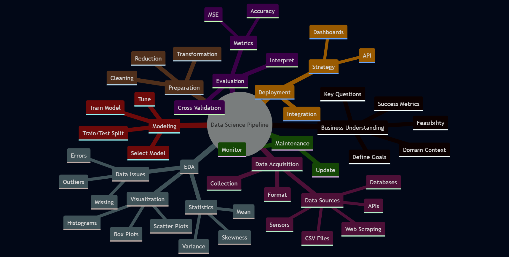 Finally, the DS pipeline doesn’t truly end with deployment. The monitoring and maintenance stage is an ongoing process crucial for the long-term success of any deployed AI or DS solution. The objective here is to continuously monitor the model’s performance in the live environment and to update or retrain it as necessary. Over time, the statistical properties of the data being fed to the model might change (a phenomenon known as “concept drift”), or the underlying relationships the model learned might no longer hold true. Regular monitoring helps detect such degradation in performance, and periodic retraining with fresh data ensures the model remains relevant and effective.