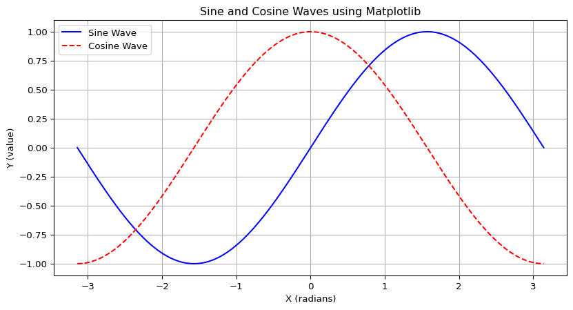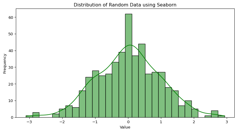 import matplotlib.pyplot as pltimport seaborn as snsimport numpy as np # Re-importing for clarity if this cell is run standalone# Let's generate some sample data for our plots x_values = np.linspace(-np.pi, np.pi, 200) # 200 points from -pi to pi y_sine_values = np.sin(x_values) y_cosine_values = np.cos(x_values) some_random_data = np.random.normal(loc=0, scale=1, size=500) # 500 numbers from a normal distribution# An example using Matplotlib to plot sine and cosine waves plt.figure(figsize=(10, 5)) # Set the figure size plt.plot(x_values, y_sine_values, label='Sine Wave', color='blue') plt.plot(x_values, y_cosine_values, label='Cosine Wave', color='red', linestyle='--') plt.title('Sine and Cosine Waves using Matplotlib') plt.xlabel('X (radians)') plt.ylabel('Y (value)') plt.legend() # Show the legend plt.grid(True) # Add a grid plt.show() # Display the plot# An example using Seaborn to plot a histogram (distribution plot) of random data plt.figure(figsize=(10, 5)) sns.histplot(some_random_data, bins=30, kde=True, color='green') # kde adds a density curve plt.title('Distribution of Random Data using Seaborn') plt.xlabel('Value') plt.ylabel('Frequency') plt.show()